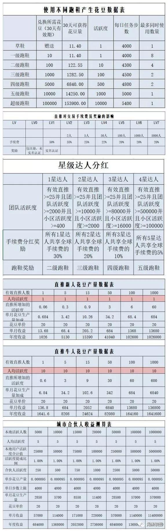 亦跑以零投资,免费的形式吸引了很多朋友:第一,是通过我们每天的运动4000步达标,来获得花豆,然后再卖出去。一个月会有11.4个花豆,大概150左右吧。第二,是通过获得推荐给更多人增加活跃度,比如你注册成功后会送你草鞋,每天有运动达标后会有0.38个花豆,一个月下来就是11.4个。一个月后草鞋到期活跃度就会显示为0,这个时候有2种选择1.卖掉,当你卖掉以后就出局不能再玩亦跑了。2.把10颗豆换1个一级跑鞋,这时候你的活跃度又升为1。如果还想继续玩就要用十个花豆换跑鞋,11.4个减去10就还剩下1.4个了,以此类推一年才16.8个,卖出的话还需要50%手续费。