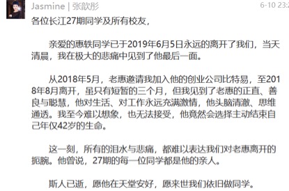 6月10日深夜,币圈在朋友圈疯狂转发一条长江商学院EMABA学员、原比特易合伙人张歆彤在“长江EMABA27官群”的微信,称比特易创始人惠轶于6月5日去世,年仅42岁。