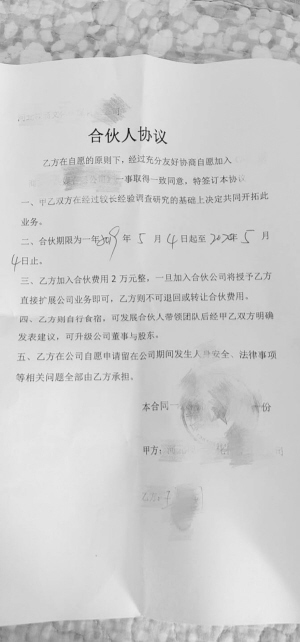 真正的“秘诀”是在课程结束后。王先生说,大约是4日晚上11点多,老师把这些学员们一个一个叫到房间里,给他们讲公司的“合伙人制度”,要求他们每人交2万元成为“合伙人”。“合伙人的职责就是开拓业务,简单说,就是通过快手等渠道邀约学员参加财商培训并成为合伙人,学费+合伙费用一共是3万元,只要邀约来的人交了这3万元,合伙人就可以挣到1.6万元。这些成为合伙人的伙伴还可以继续邀约合伙人,就这样一级一级地邀约,赚的钱会很多。”王先生说,到那时他才明白这家公司的赚钱模式根本不是靠信用卡业务,而是靠拉人头来赚取高价的财商培训费和合伙费。王先生表示不想入伙,但几位老师对他进行了轮番轰炸式洗脑,他只好说,实在没钱。找他谈话的张老师说,没钱没关系,有信用卡吗?可以先刷出来交一部分定金。王先生随身携带的只有一张额度3000元的信用卡,张老师当场帮他把信用卡套现3000元,作为合伙人的定金,签了合伙人协议,这才放王先生出房间,当时已是5日凌晨。