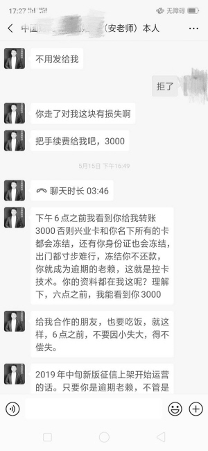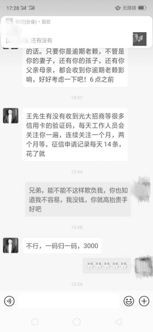 协助他办理了信用卡的安老师发现他已回西安,不停地给他打电话、发微信催款,并且主动把服务费从8000元降到了3000元。看王先生没有付款的意思,安老师开始用他的个人资料来威胁他。因为协助办理信用卡,安老师有王先生全部的个人资料,包括身份证号、银行卡号、预留手机号等等,他告诉王先生,如果不给他转账3000元,会想办法冻结他名下所有的银行卡和信用卡,让他不能还款,成为老赖,他的妻子、孩子、父亲、母亲都会受到影响。