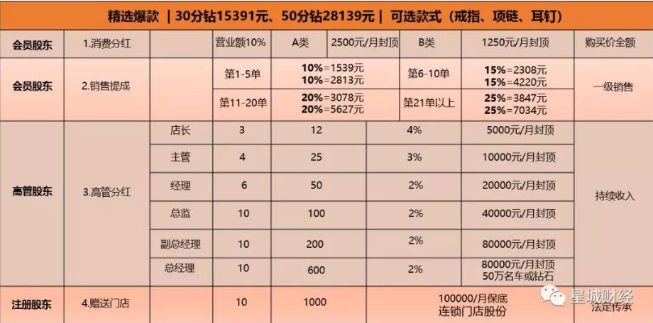 购买任意一款“存爱珠宝”的钻石产品即可成为会员,会员在不推荐会员的情况下每月都可返现,以15391的价格来算每月可返现最少1250元,28139的可返现2500元,返现只是个人的一部分,分享赚钱才是本质,成为会员后每推荐一个会员购买即可拿产品10%的佣金,发展的会员数不同等级也不一样,以发展12个会员成为店长来算,每月可拿到5000元的分红,不包括直推奖励,发展25个会员成为主管级别每月可拿10000元,成为经理发展50个会员每月可拿20000元以此类推总经理发展600人每月80000元分红,该模式下发展的会员没有层数限制只要是从一个人发展下去的团队任何一个人发展的会员都算在其中,该模式已经涉嫌非法传销,而成为会员每月拿消费返现的钱也只不过是拿后面的钱来填前面的坑,消费返现的的此种模式也已经涉嫌非法集资!