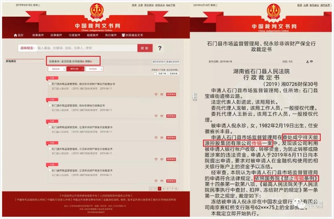 6月18日,湖南省常德市石门县人民法院公布十几起“祥天集团”传销一案的财产保全行政裁定书。鉴骗了解到,石门县市场监督管理局(以下简称:石门县市监局)在查处咸宁祥天能源控股集团有限公司(以下简称:咸宁祥天集团)传销一案中,发现该公司利用倪某珍、蔡某燕、沈某非、葛某财、江某非、王某玉、赵某全、王某杰、咸宁祥天空气能电力有限公司的银行帐户收取、转移资金。