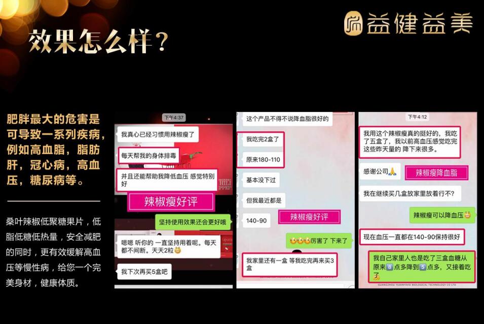 在代理商发给网信视点的辣椒瘦宣传文件中这样写到:辣椒瘦14天见效,50万成功案例,90%以上42天减脂5—25斤,无毒副作用、不反弹。同时,还写到辣椒瘦可缓解高血压等慢性疾病,健康体质。