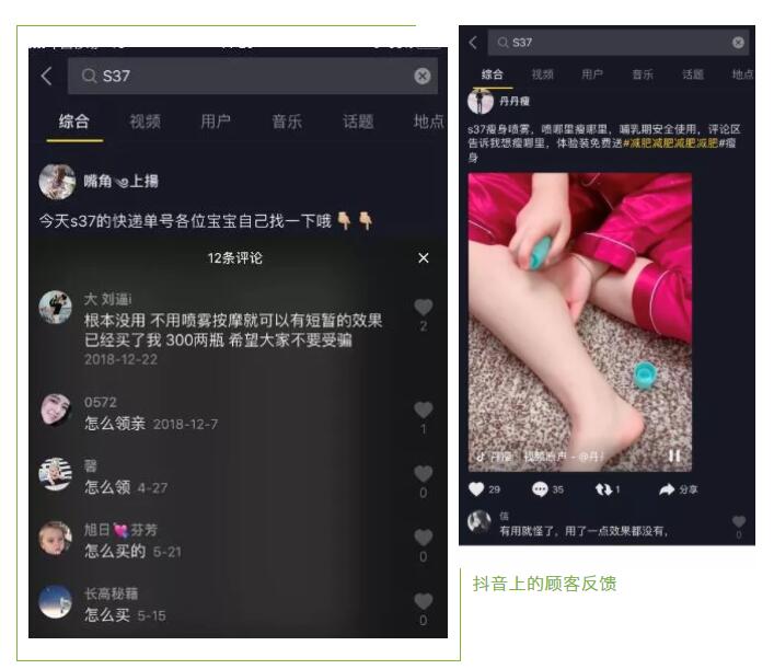 近日,网信视点发现抖音上有许多瘦身视频,视频中的体验者将喷雾喷到腰、腿等部位,瘦身效果立竿见影。这款名叫“S37喷雾”的化妆品,真的能达到如此神奇瘦身的效果吗?网信视点决定一探究竟。