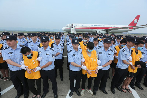 6月26日下午,首批63名通讯网络诈骗犯罪嫌疑人被重庆警方从柬埔寨押解回国。 重庆警方 供图