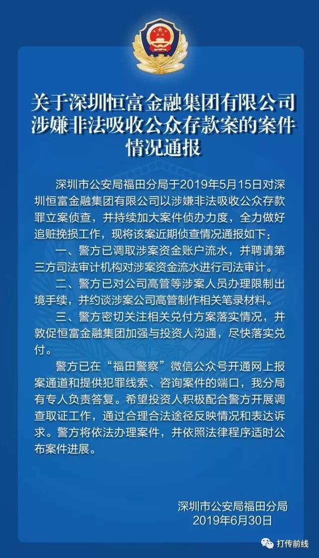 2019年6月30日,福田警方发布《关于深圳恒富金融集团有限公司涉嫌非法吸收公众存款案的案件情况通报》。
