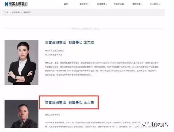 资料显示,恒富金融集团董事长兼法定代表人为王富贵。根据工商信息,王天贵、王富贵分别持股70%与30%。不过,该公司官网并未对王富贵相关信息进行披露。目前,恒富金融集团官网也下线了该公司副董事长龙艺佳等人相关资料介绍。