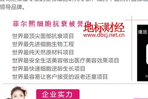 该项目不光宣传“只需轻轻一喷就能年轻10岁”,并表示产品原料来自于瑞士阿尔卑斯山脉活体细胞研究中心。更加令人惊讶的是,该公司甚至在官网上吹嘘“菲尔熙细胞抗衰”为“世界最顶尖面部抗衰项目、世界最先进细胞生物工程、世界最纯天然原材料项目、世界最安全生活美容做出医疗美容效果项目、世界最快速细胞逆龄生长项目、世界最容易让客户接受的返老还童项目”。
