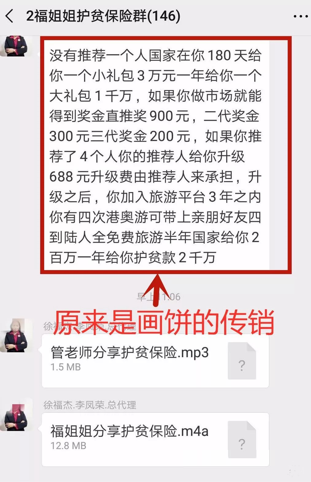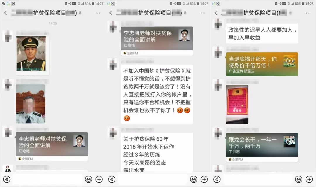 护贫保险群中,几乎都是半军事化管理,每人头像、昵称制式相同。在骗子们的语境里,他们是在铸造抵御外敌的“经济长城”,解救民族大业难民等等。