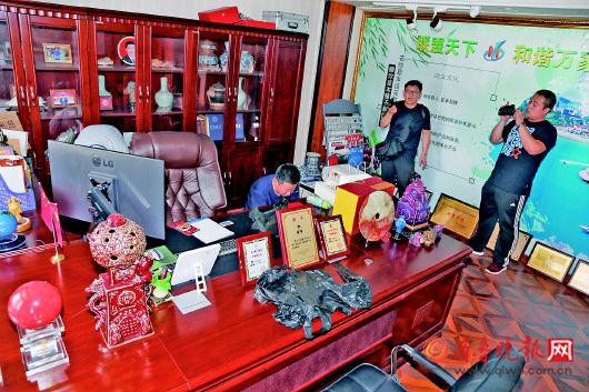 民警在王某刚办公室内搜出大量其花钱买来的牌匾、证书等。(资料片)