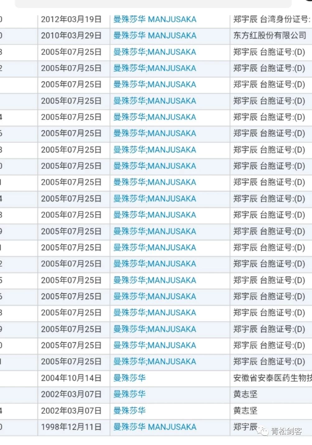其公司模式和申齐,客登庸一样,都是在国外成立公司境内投资,这里提一下信邦也是一样的套路。深的吴齐南的真传。而被郑宇辰注册完的商标曼殊莎华,瀚齐的东家东方红股份有限公司居然持有一个。