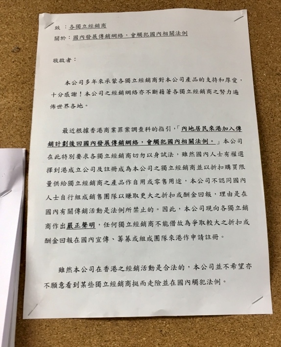 香港传销公司内张贴的被认为是规避责任的公告。摄影:刘向南