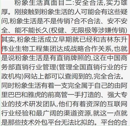 除了返佣比花生日记高,更是对外宣传自己是安全合法的。据粉象生活公开宣传,公司成立早期就已经和吉林东升伟业生物工程集团达成战略合作关系,也就是说粉象生活是有“直销牌照”的。中国网财经记者就此事向粉象生活递送采访函,但截至发稿,尚未得到回复。