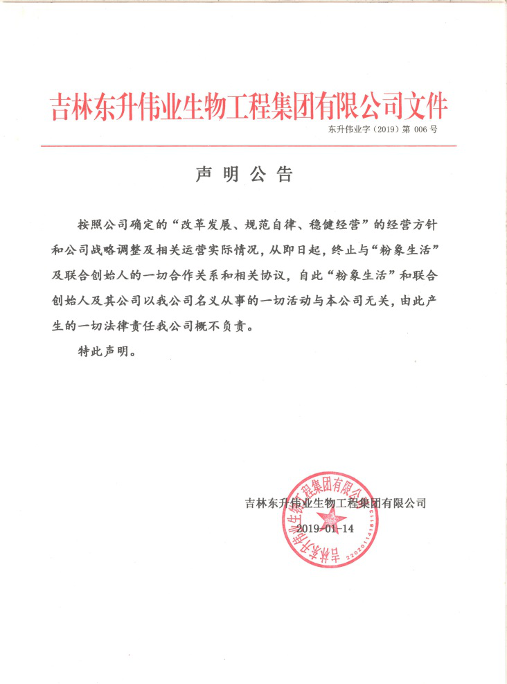 而吉林东升伟业生物工程集团的相关负责人向中国网财经记者表示:“我司直销板块年初已暂停,整顿规范中。我公司与粉象生活的电商合作已于今年1月份终止。”。