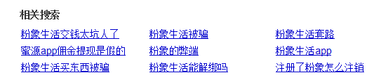 记者通过搜索引擎发现,粉象生活在百度的“相关搜索”下的负面内容占据三分之二。多位网友表示,“粉象生活骗局大揭秘,很多人已经被骗…”“小心粉象生活日入上千骗局曝光”“粉象生活被骗违法骗局…”