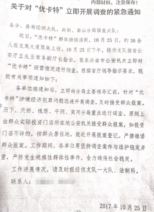 根据一份文件显示,2017年10月25日下午,由于群众反映强烈,山东省公安厅常务副厅长指示,要求济南市公安机关立即对“济南优卡特”的经营情况进行彻查,各单位接到通知后立即向分局主要领导汇报,针对“优卡特”涉嫌经济犯罪的问题迅速开展调查,及时接受群众报案。并将历下、天桥、槐荫、平阴、商河等地区作为调查重点,严禁推诿群众报案。要求及时将进展情况向济南市公安局经侦支队进行汇报。