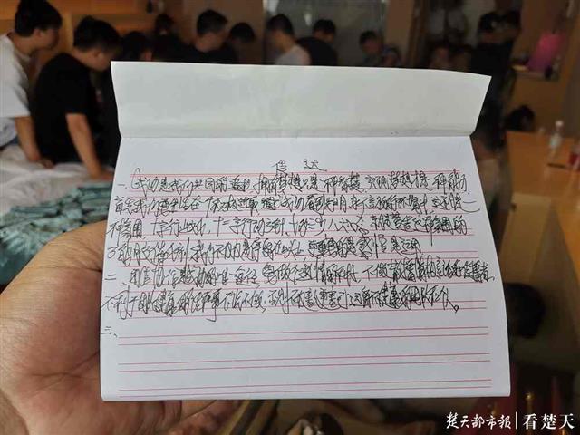 楚天都市报记者现场看到了他们手写的相关资料,如“检讨书”,上面写道“我对错误行为深刻反省,乱放行业资料是不自律的行为,我们每周的行业会上都强调自律是行业的命根子……我要认真学习《生活经营管理二十一条》里面的每一条,并落实到位”;再就是传达“高层指示”,众人笔记一致记录:“不做消极言论的散播者,不利于团队健康的话和事不说不做……”