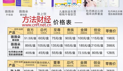 “薇薇国际”以香港薇薇国际集团(中国)有限公司为品牌,山东薇薇朵生物科技有限公司及广州瞻琳生物科技有限公司、山东瞻琳生物科技有限公司为核心运营主体,旗下主要有薇薇朵女性私护套装、肽上饮人参肽饮品、儿童肽益生菌核桃牛股肽饮、牡丹琳达沁润植萃润养套盒等产品。从方法财经近期获悉的材料显示,“薇薇国际”旗下产品以消费为加入门槛,最低一档“零售”级别分为“基础版198元”、“升级版398元”。除此之外,“薇薇国际”还设计了零售、创业会员、金牌、贵族、至尊、总代、官方、执行董事的晋升体系。