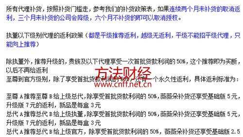 该公司主要以提货业绩作为晋升标准,同时,“薇薇国际”也给予拉人提货进行返利,只不过,“薇薇国际”拉人时不允许将人拉到自己名下而要“推荐”到上线名下。不光拉新会员有奖励,推荐现有会员升级也有各种回报。发现,为了刺激会员级别只升不降,“薇薇国际”规定所有会员“连续两个月未补货的取消返利,三个月未补货的公司会降级,六个月不补货的即可以取消授权”,在“不进则退”的制度设计下,会员为了保住级别只能“迎难而上”。