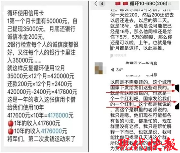 现代快报记者从常州市反诈骗中心获悉,常州市民刘某报警称,他的家人被拉进一个微信群,群内有人推销循环信用卡,只需将个人信息卖给对方,再办理一张信用卡,就可以得到一张额度5万的信用卡。这张信用卡每个月可提现3.5万元,到期时只需还款100至200元,过后卡里又恢复为5万元额度,共可提现40多万。