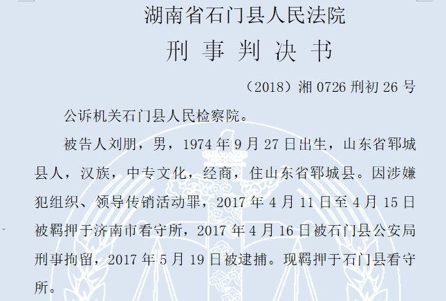拍卖公告称,这十套房屋是湖南省石门县人民法院在执行被执行人刘朋组织、领导传销罪一案中,被放到司法拍卖网络平台上公开拍卖的。据裁判文书网,近期,湖南省石门县人民法院以组织、领导传销活动罪,判处“SKY云世纪”的“一代天骄”团队传销头目刘朋等五人有期徒刑三年六个月到一年不等,并处罚金五十万元到十万元不等。
