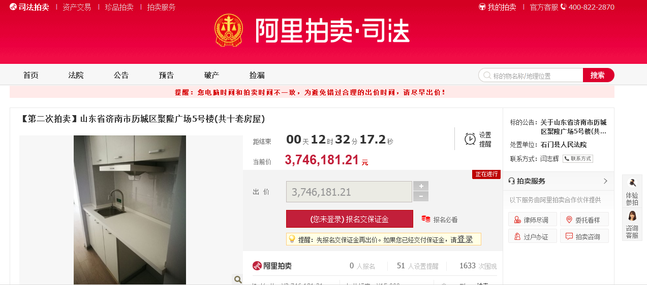 在阿里拍卖的竞买公告里,记者看到这十套房屋的具体位置为山东省济南市历城区聚隆广场5号楼的2314、2315、2316、2317、2318、2319、2320、2321、2322、2323号,单套房屋面积在32.84平方米到39.05平方米之间。上述十套房屋网络询价定价总价为6689609.3元,约合每平方米18373元,拍卖保留价(起拍价)3746181.21元、保证金500000元、增价幅度15000元。拍卖时间从2019年7月22日10时至2019年7月23日10时止(延时除外)。