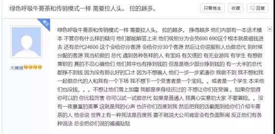 2018年9月份,张丽丽加入牛蒡大王做总代,说到加盟的原因,她也是无意间带孩子的时候在百度上看到牛蒡大王的广告以及牛蒡大王总裁陈思的招商热文,张丽丽被眼前一则宝妈在家带孩子能赚很多钱所吸引,热文最下面还有一个微信二维码,张丽丽通过扫二维码加了一位自称陈思总裁的人,然而他立刻推荐一位叫做月月的名片让张丽丽加上,月月让张丽丽交750元/5盒做牛蒡大王的代理并告诉张丽丽怎么能赚大钱。