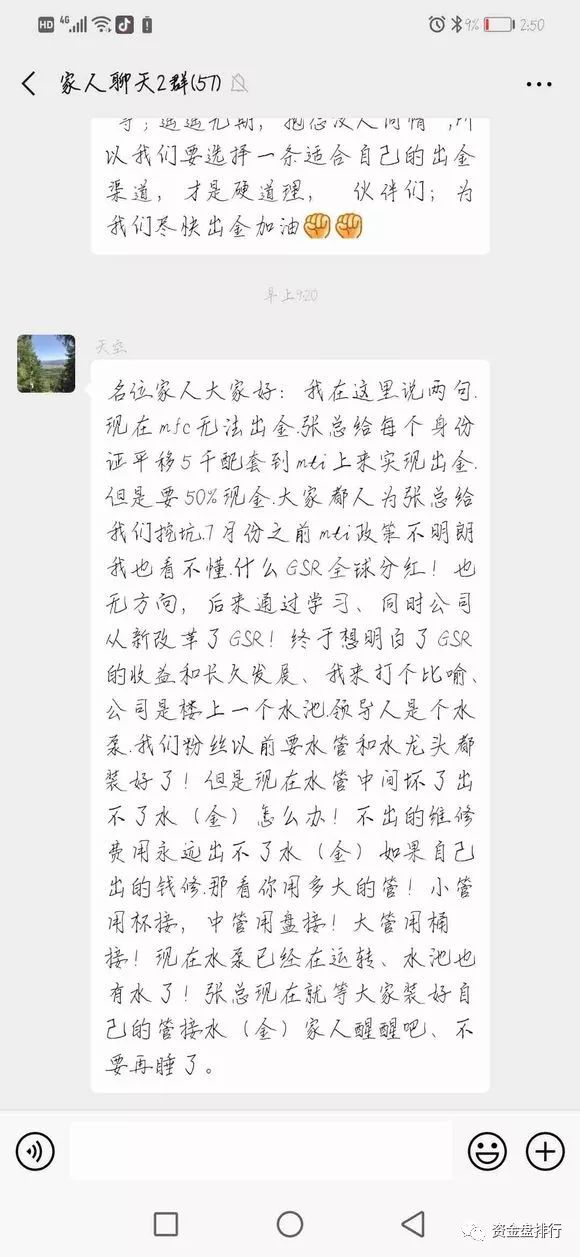 这个出金也是一样套路,也是忽悠你入金,50%现金,50%配套出金。还讲了个修水管的故事。讲的这个故事也是很形象,把MBI投资者也很形象说进去了。水管坏了,你要修水管。你还需掏电钱,掏完电钱,没电泵怎么转?掏完电钱泵坏了,泵为大家服务得掏钱吧,把泵修好了,但泵小人多,所有得轮流接吧?这真他吗形象。这水是啥,水是你们原来交的钱,绕这么大弯子,交钱取自己的钱,人家存银行给利息,你们存钱要花钱取钱。