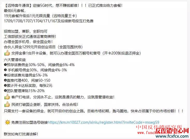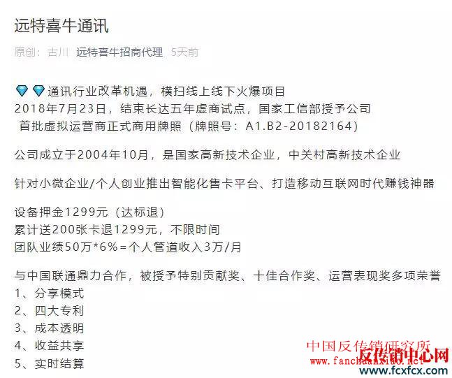 近日有网友咨询一个“虚拟运营商”项目:远特喜牛通信传销