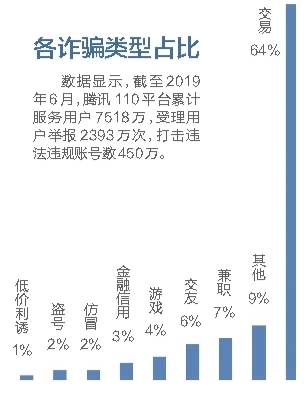 数据显示,截至2019年6月,腾讯110平台累计服务用户7518万,受理用户举报2393万次,打击违法违规账号数450万。