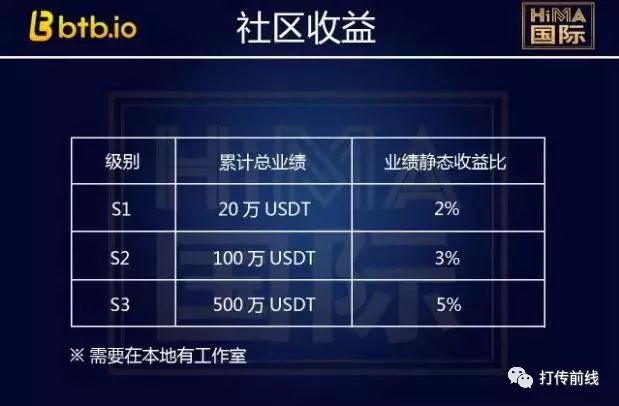 【四】社区奖励S1节点(完成20万USDT,拿无限代收益的2%) S2节点(完成100万USDT,拿无限代收益的3%) S3节点(完成500万USDT,拿无限代收益的5%) 条件:需要在当地有工作室