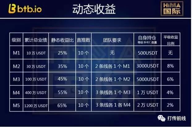 【三】动态奖励️1️⃣团队总业绩达到10万USDT价值的BHEC 拿无限代收益的25%。需要直推达到10个 【自己持仓价值500USDT以上的BHEC】 ️2️⃣团队总业绩达到30万USDT价值的BHEC 拿无限代收益的35%,平级奖拿8%,需要2条线各有1个M1,直推10个!【自己持仓价值3000USDT】 ️3️⃣团队总业绩达到100万USDT的BHEC 拿无限代收益的45%,平级奖拿6%,需要2条线各有1个M2,直推10个 【自己持仓价值5000USDT】 ️4️⃣团队总业绩达到400万USDT的BHEC,拿无限代收益的55%,平级奖拿4%,需要3条线各有1个M3,直推10个 【自己持仓价值1万USDT】 ️5️⃣团队总业绩达到1200万USDT价值的BHEC,拿无限代收益的65%,平级奖拿2%,需要3条线各有1个M4 ,直推10个 【自己持仓价值2万USDT】