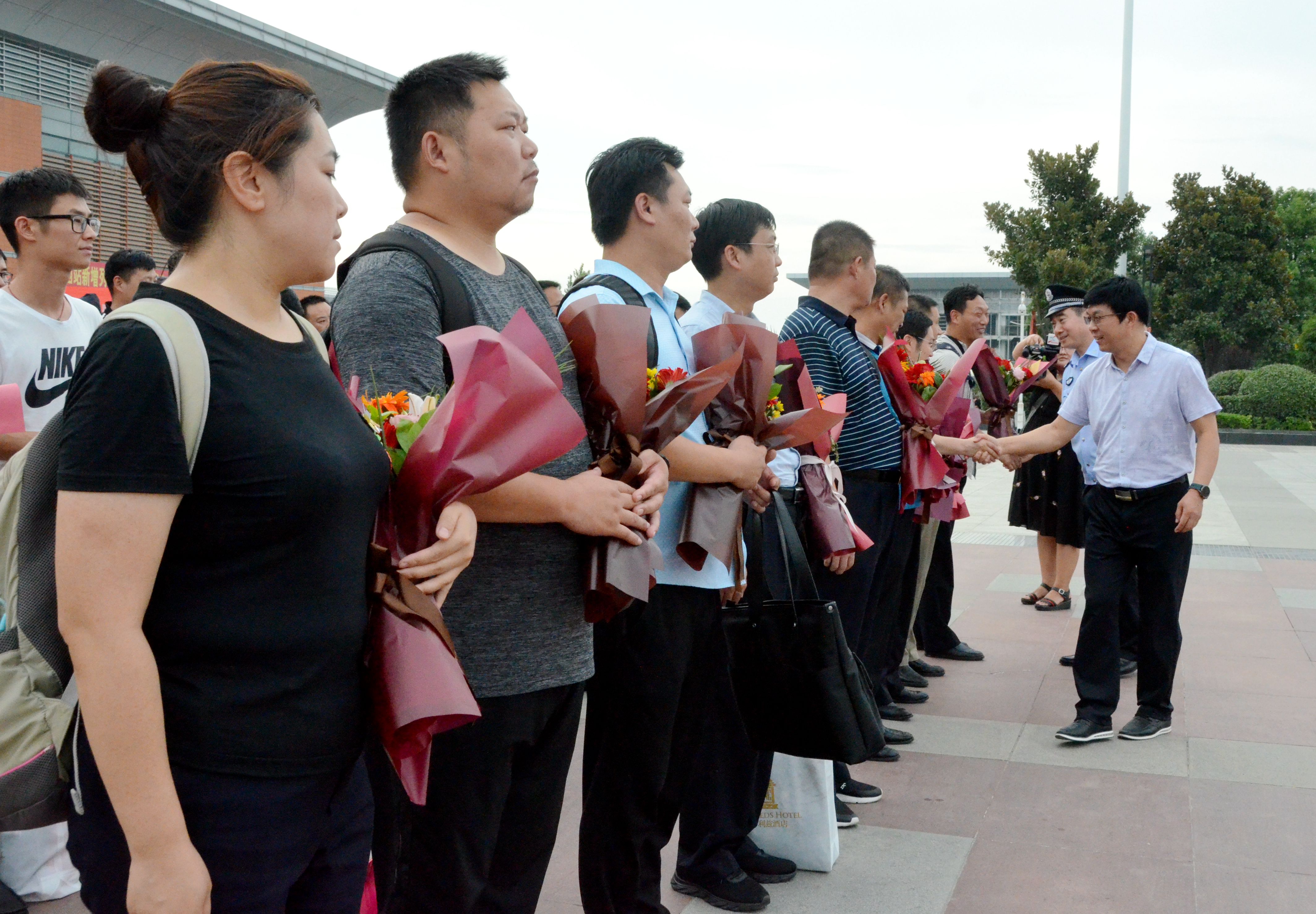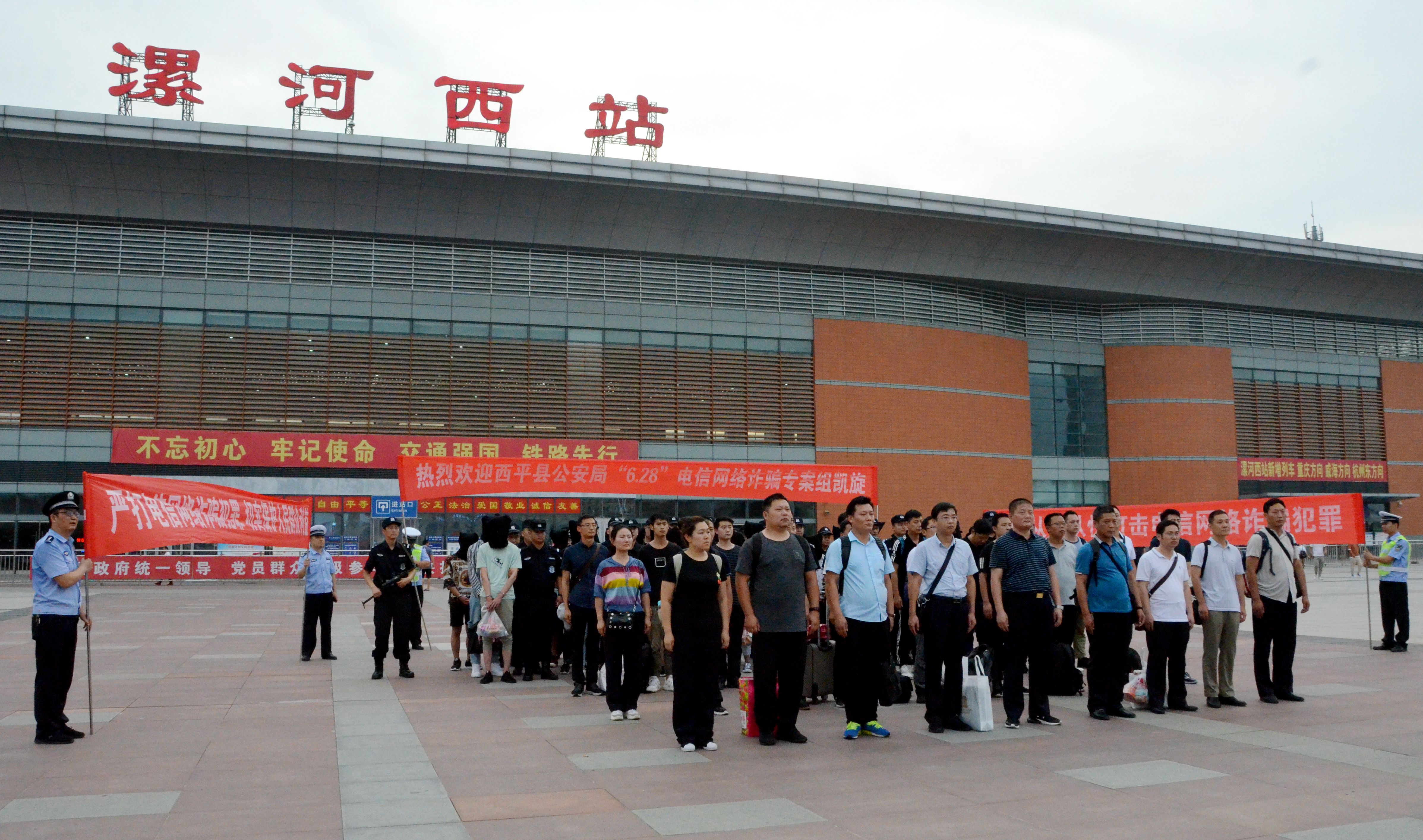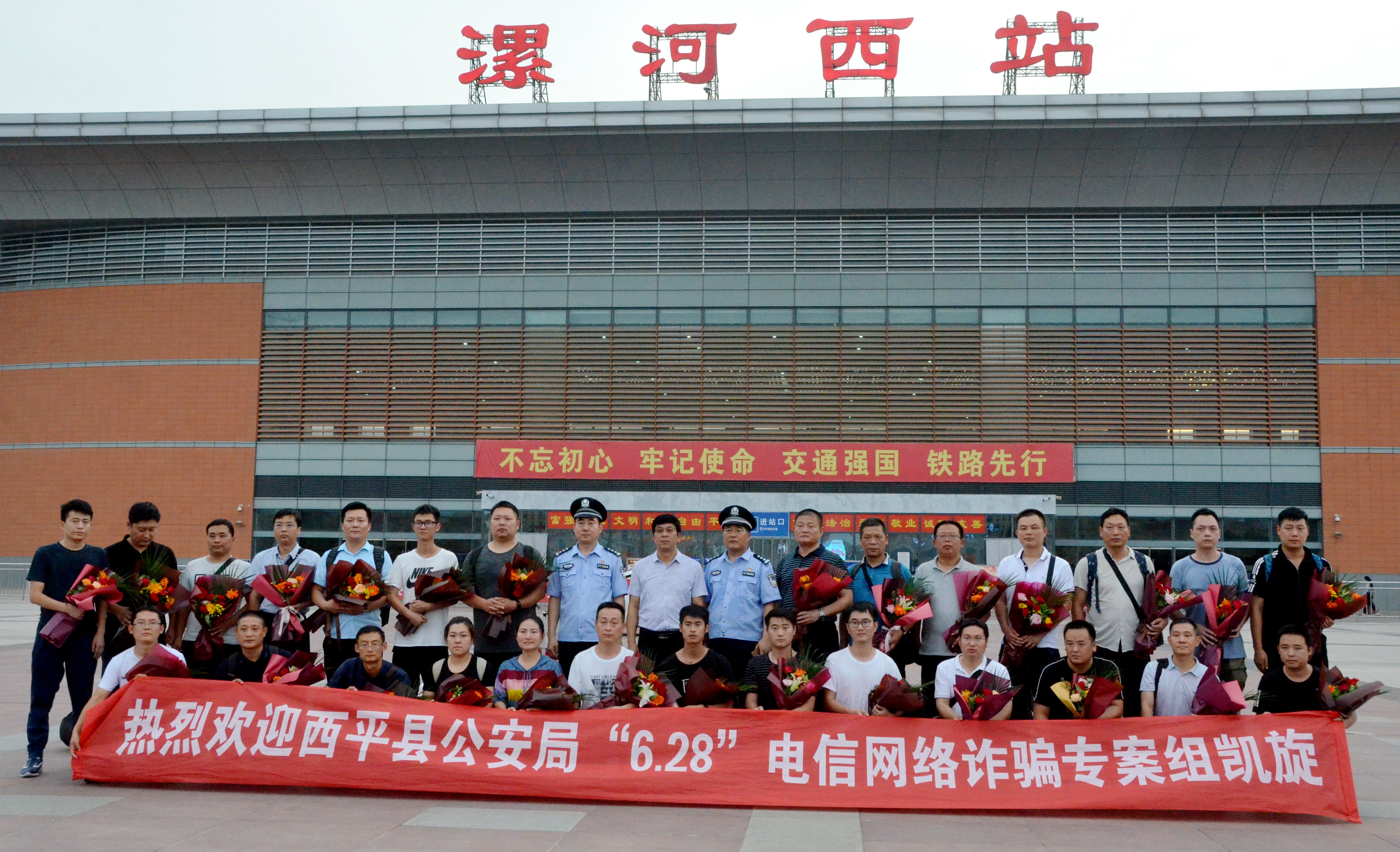 7月24日下午6时许,驻马店市西平县公安局在漯河高铁站广场隆重举行欢迎仪式,迎接“6.28”打击电信网络诈骗专案组凯旋。