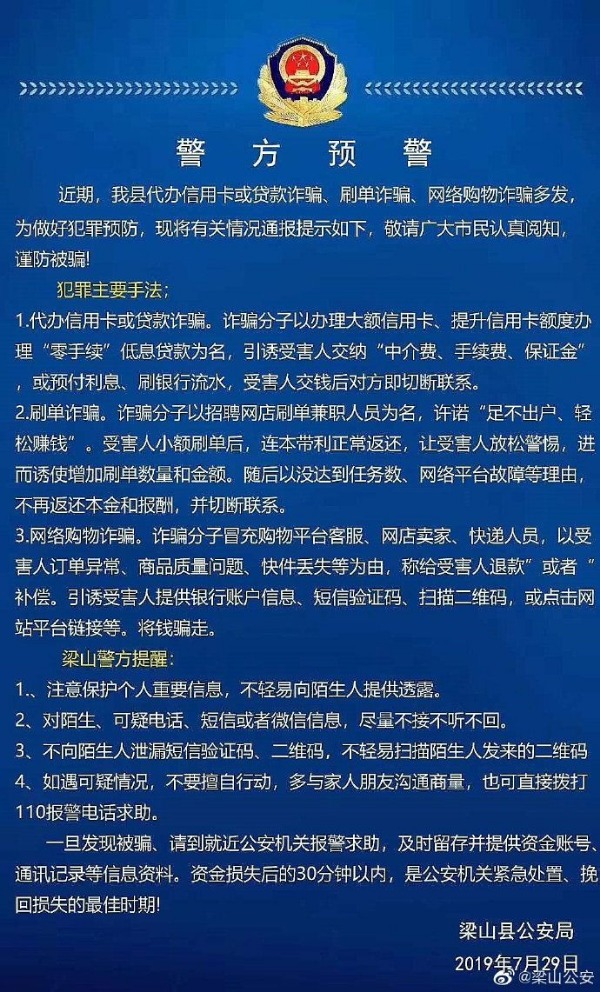 近期,梁山县代办信用卡或货款诈骗、刷单诈骗、网络购物诈骗多发,为做好犯罪预防,现将有关情况通报提示如下,敬请广大市民认真阅知,谨防被骗!