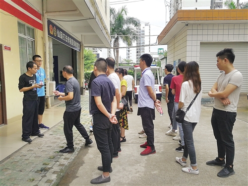 一批涉传人员在仙葫打击传销宣传教育室前接受教育遣返。