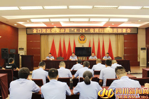 6月29日11时,在乐山市公安局的统一指挥下,乐山市金口河区公安分局召开“4.26”特大电信诈骗案云南行动组动员部署会。此次行动也是乐山市金口河区公安分局史上首次大兵团跨省抓捕作战。