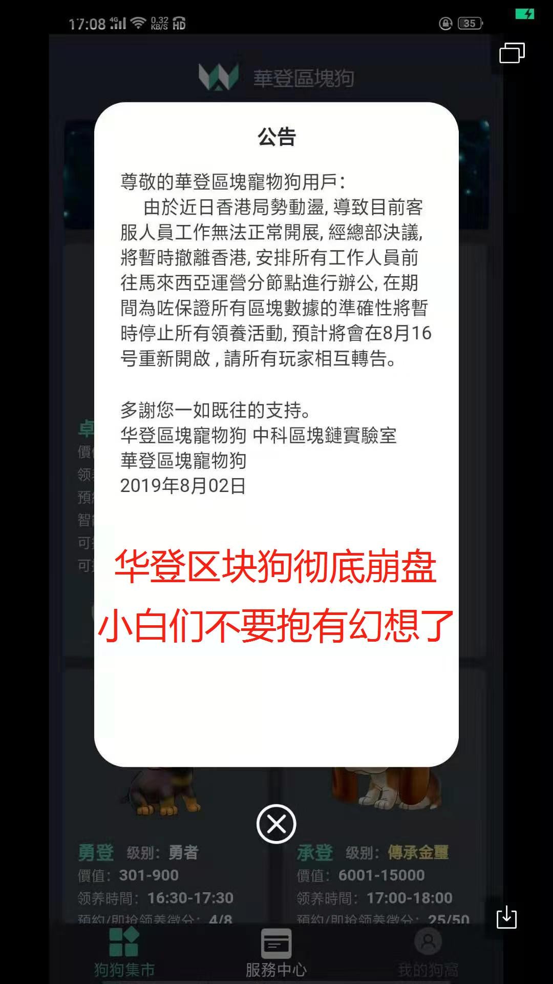 华登区块狗今日突然发布公告,宣布停盘。老玩家都知道平台发布这样的公告意味着什么,崩盘的理由千千万,姐觉着这个理由最扯淡。姐前面就已经给大家爆料了,华登高通就是一家包装成香港的公司,实际上就是一家内地的网络公司,从前面频繁的更改制度就知道数据不理想了,往往制度的调整只会增加市场的恐慌情绪,导致会员流失速度加快,虽然平台后面不断的释放利好消息来刺激市场,但新会员的增长还是弥补不了团队撤离导致的巨大缺口,姐前天就预警华登区块狗会崩盘,只是没想到会崩的这么快。
