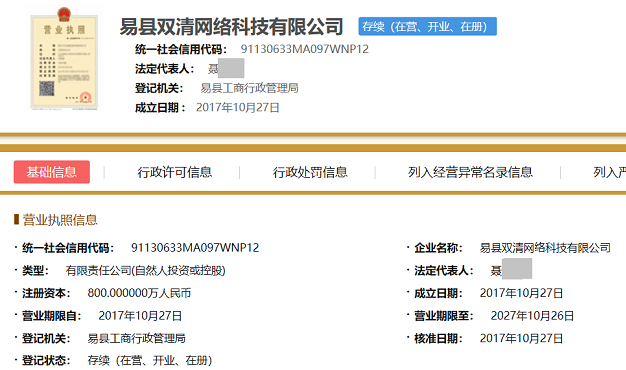 不过,聂先生曾于2017年10月初在老家丢失过身份证。就在当月,1300公里之外,双清科技在河北省保定易县成立,不仅从工商部门取得了营业执照,还从银行获得了开户许可证。