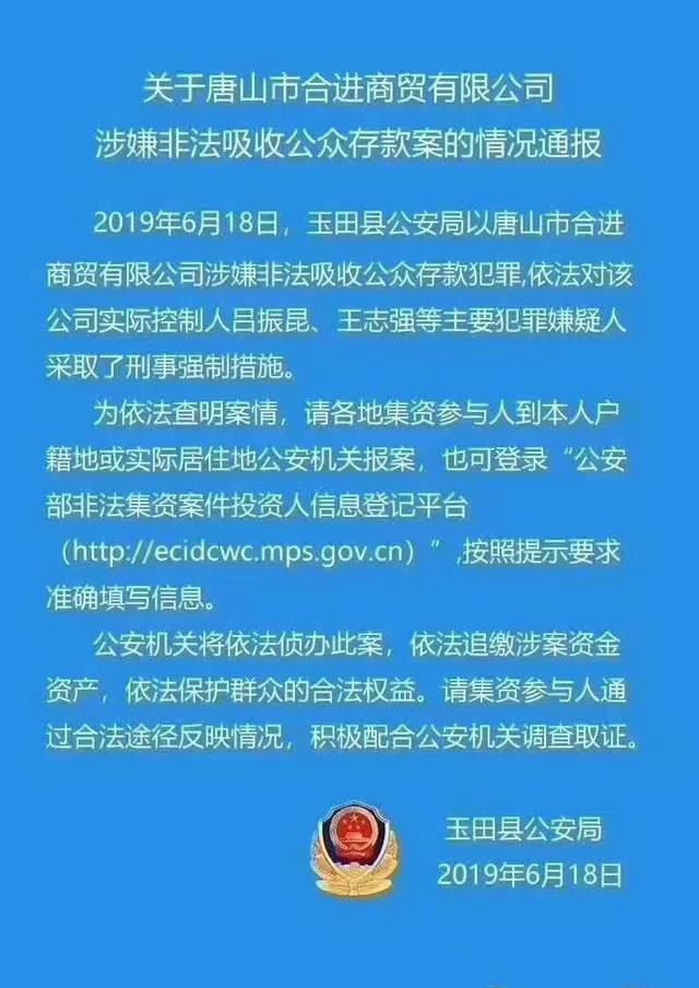 昨日,玉田县公安局发布了《关于唐山市合进商贸有限公司涉嫌非法吸收公众存款案的情况通报》。