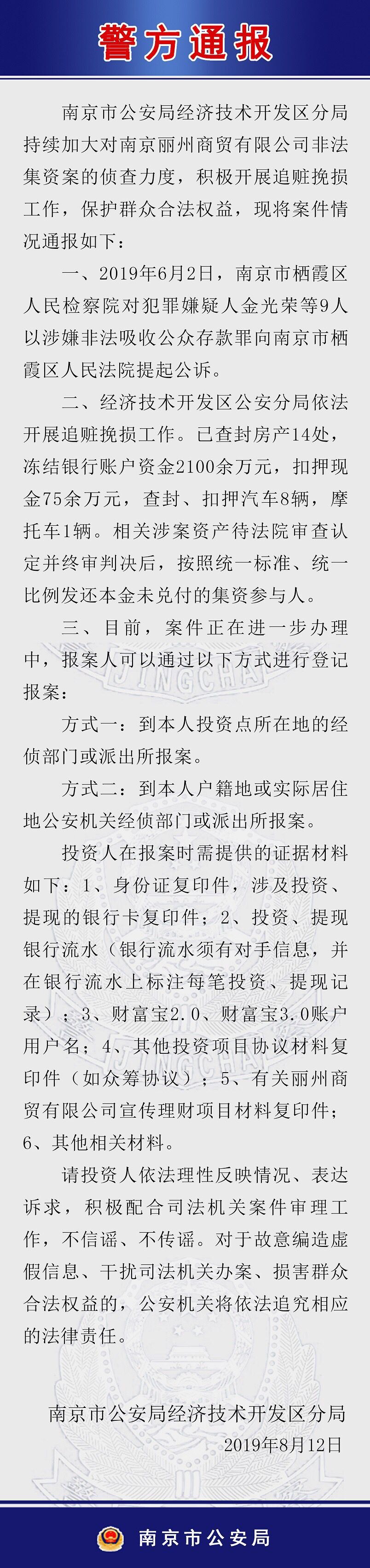 8月12日,南京市公安局经济技术开发区分局发布了关于南京丽州商贸有限公司非法集资案的通报,警方请报案人进行登记报案。同时,警方请投资人依法理性反映情况、表达诉求,积极配合司法机关案件审理工作,不信谣、不传谣。