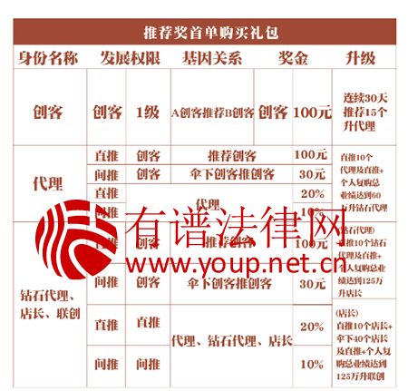 “礼当家”运营主体为广东礼当家优选互联网科技有限公司、广州市礼当家互联网科技有限公司,该公司招商人员向有谱法律网介绍称,缴纳299元即可成为创客,成为创客后就获得了拉人权力,拉一个人奖励100元。除此之外,“礼当家”还设置了代理、钻石代理、店长、联创多个级别供会员晋升,每晋升一个级别就可以拉更多层级的人,直接拉人和自己下线拉人都有提成。