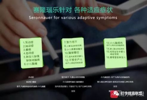 该产品的多个宣传及销售页面称,赛隆瑙乐可促进脑神经修复、提高脑部微循环,并针对、适用抽动症、癫痫、新生儿缺氧缺血性脑病、小儿脑瘫、小儿病毒性脑炎、脑脊髓炎、婴儿臂丛神经损伤等16种症状。