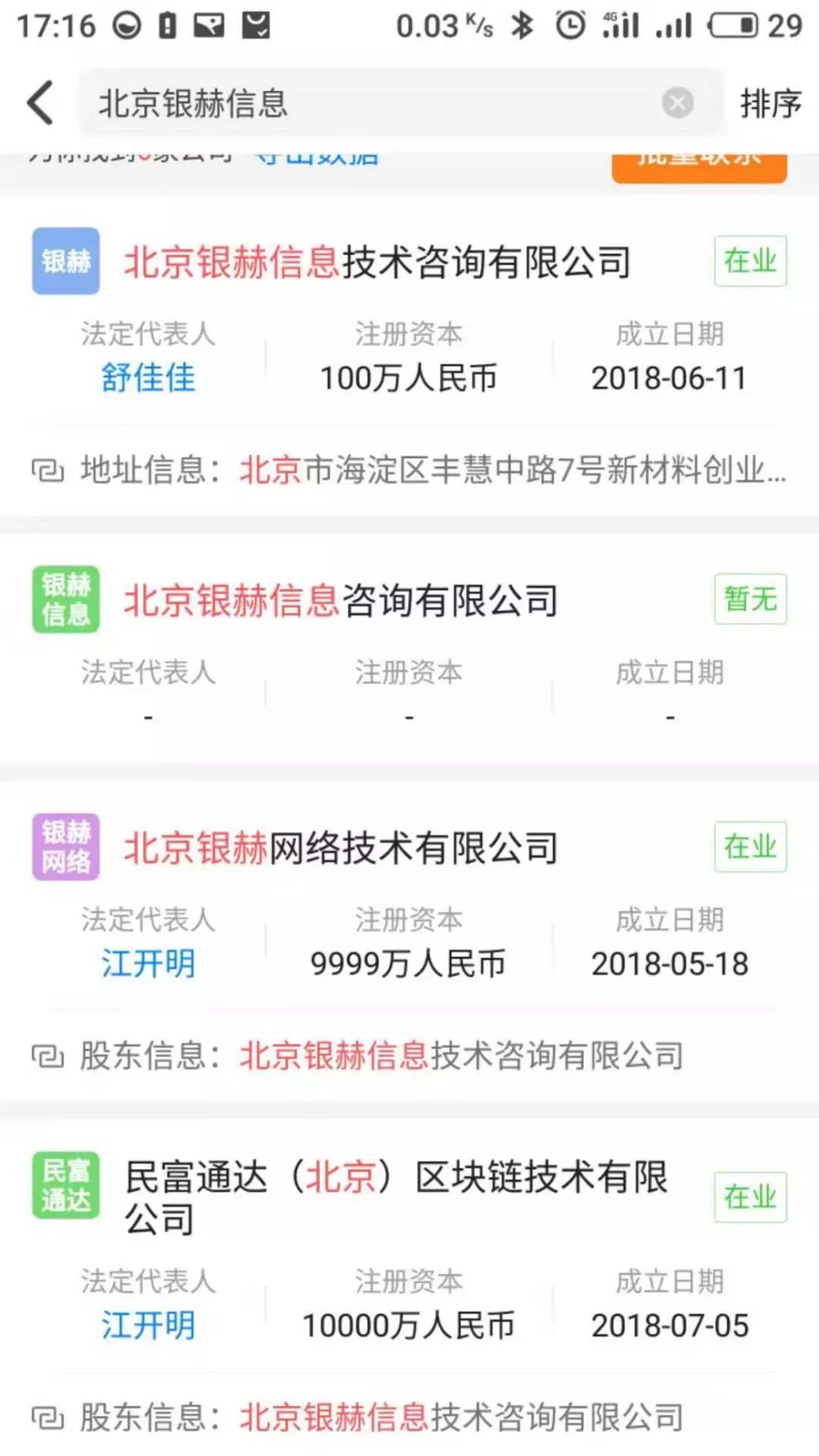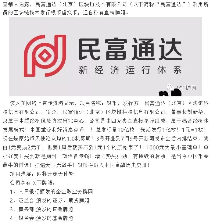通过天眼查得知“北京银赫信息技术有限公司”投资了多个公司,其中一个就是“民富通达(北京)网络科技有限公司”,而之前就有文章爆料该公司自称央企,发行虚拟币欺骗老百姓投钱!