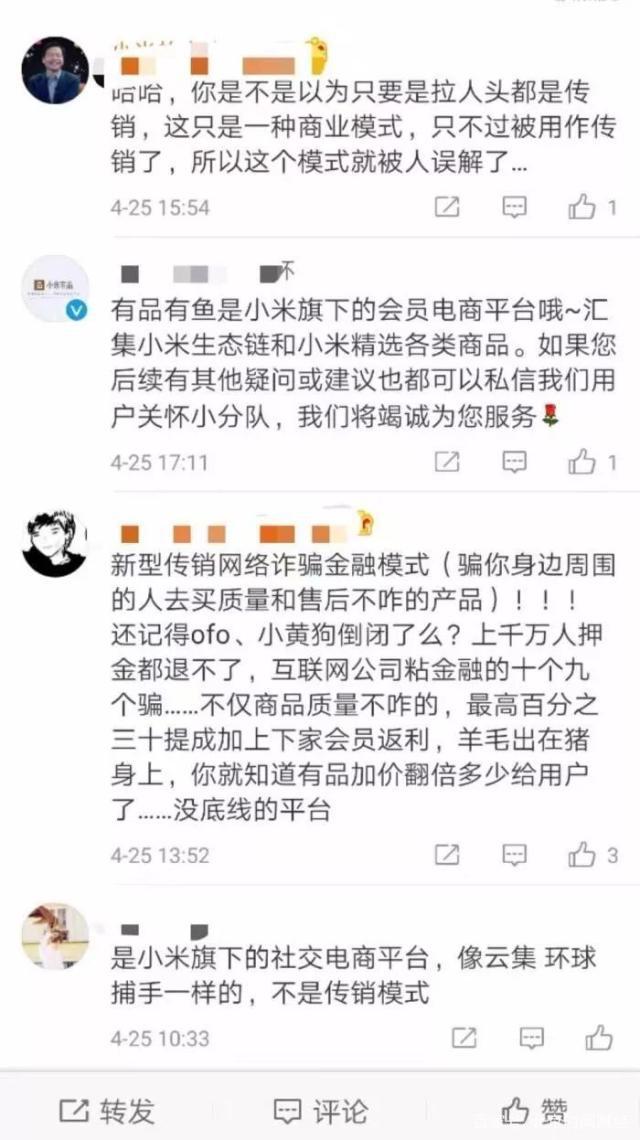 而在个人为主体的社交媒体中,对有品有鱼的声音明显不是那么友好,甚至“小米有品有鱼是否传销”的质疑频发。