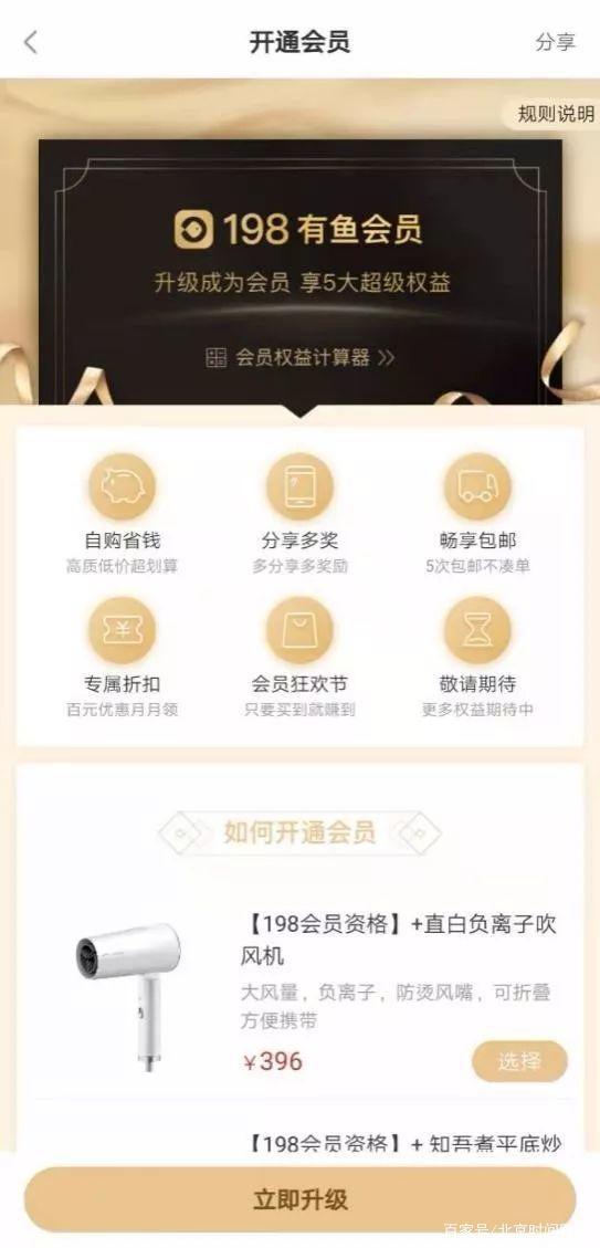 如果仅仅到此为止,有品有鱼与其他类似购物APP区别并不明显。但在APP点开首页的“奖励中心”后,可以花费396元开通会员。会员介绍中可见多项会员权益。其中,不仅有自购省钱的推荐,也包括一项神秘的“分享奖励”。
