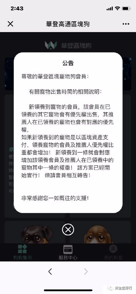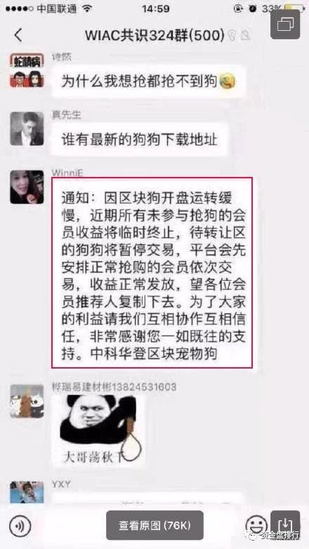 “华登区块狗”最新公告:大概意思16号开网参与抢狗的会员有机会优先出售狗狗,还有领导人也会有优先的机会。公告一直解释新参与抢狗的会员,没有说16号之前的会员的狗怎么处理。明摆着让你在投资,把推荐人加上,是为了让你推荐人拉人来投资。