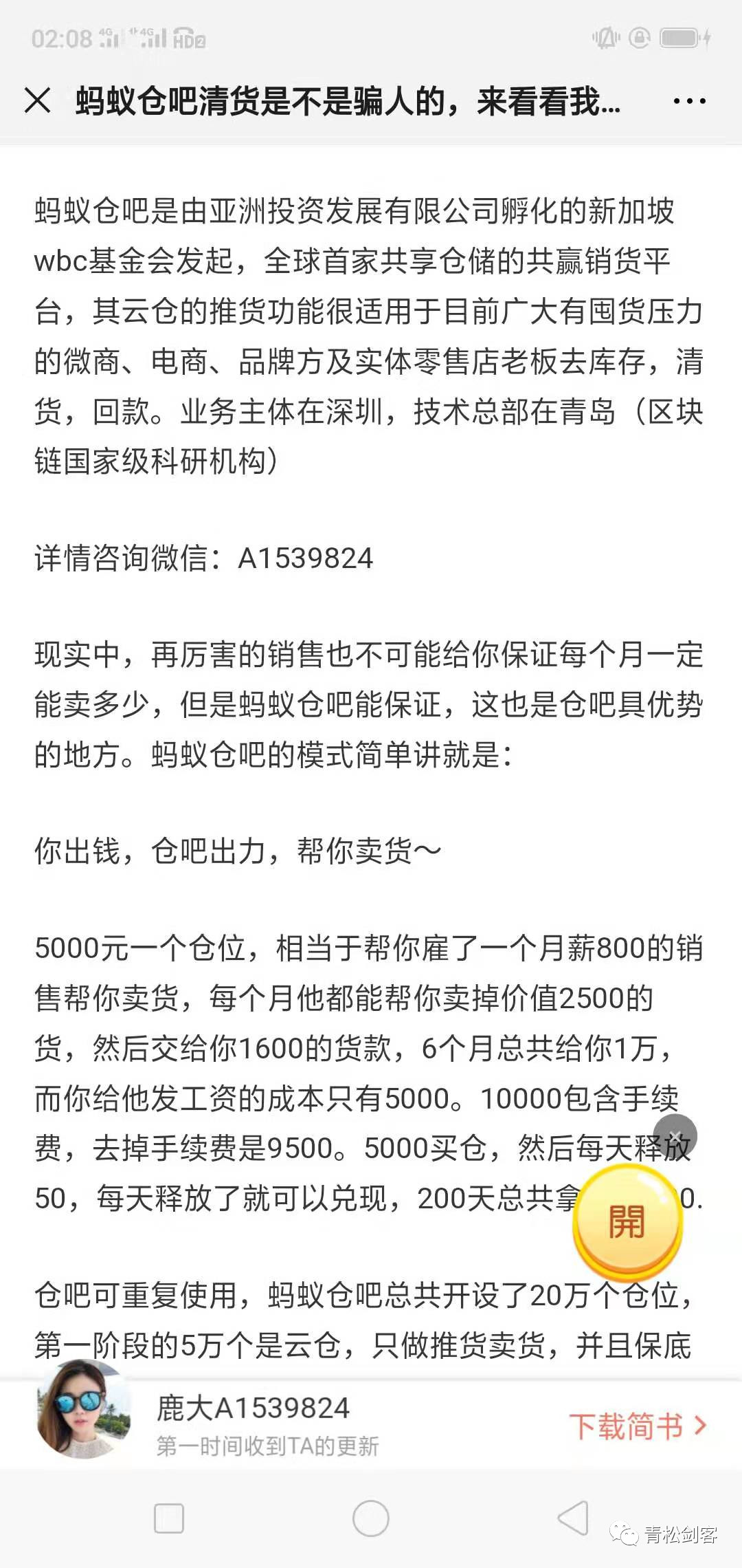 微商直销,造就了大量的难民,而一些别有用心之人,趁着难民走投无路,假借清货之名大玩资金盘骗局。划得来已经被绵阳立案,相关人员被抓。汇品万货被郑州警方立案,案件在侦查中,而其他的平台也纷纷出事。而在这多事之秋,从事区块链的操盘人员看准了这群韭菜们。而成立了蚂蚁仓吧来收割。下面我们就来看看这个平台是怎么忽悠人的。