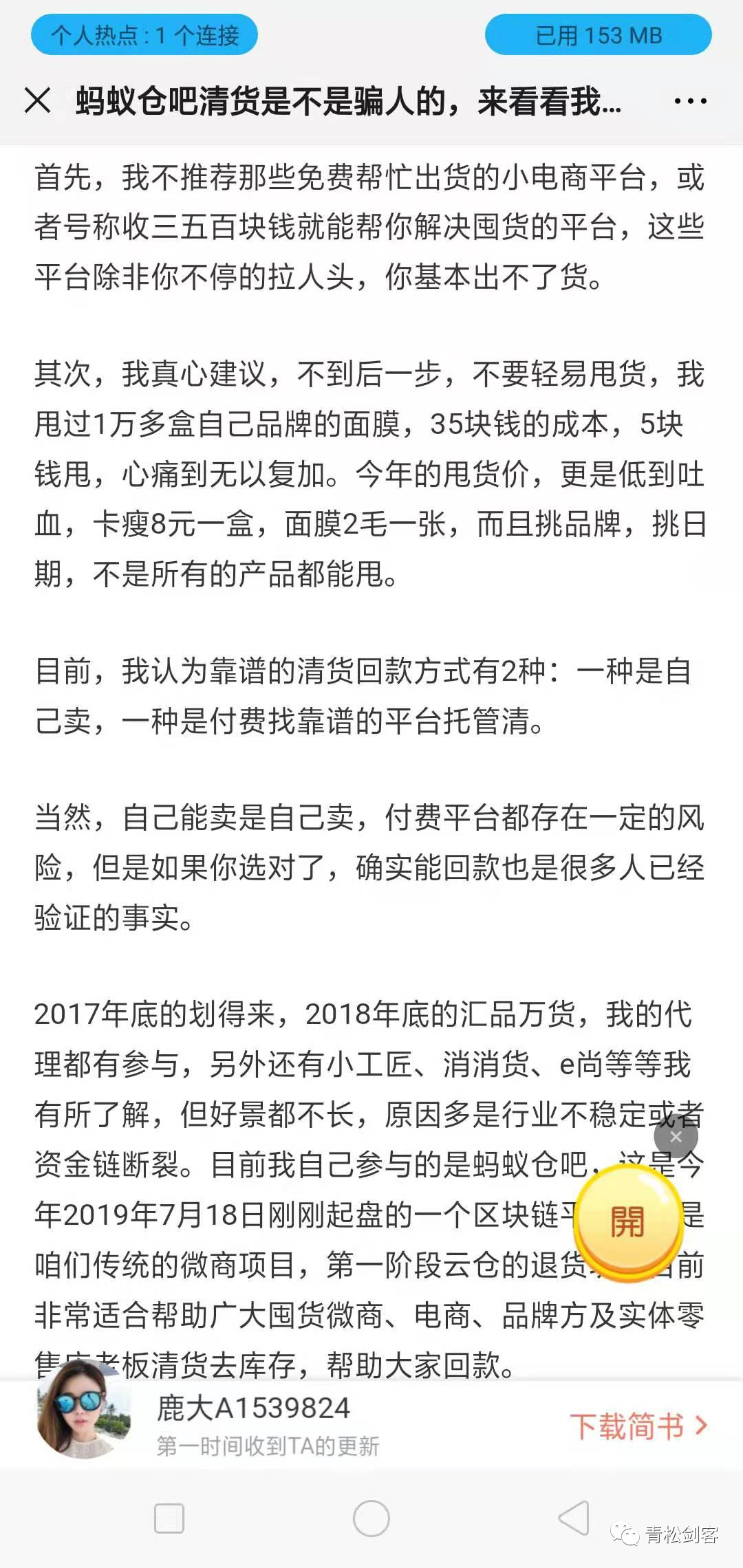 2017年底的划得来,2018年底的汇品万货,我的代理都有参与,另外还有小工匠、消消货、e尚等等我有所了解,但好景都不长,原因多是行业不稳定或者资金链断裂。目前我自己参与的是蚂蚁仓吧,这是今年2019年7月18日刚刚起盘的一个区块链平台,不是咱们传统的微商项目,第一阶段云仓的退货功能目前非常适合帮助广大囤货微商、电商、品牌方及实体零售店老板清货去库存,帮助大家回款