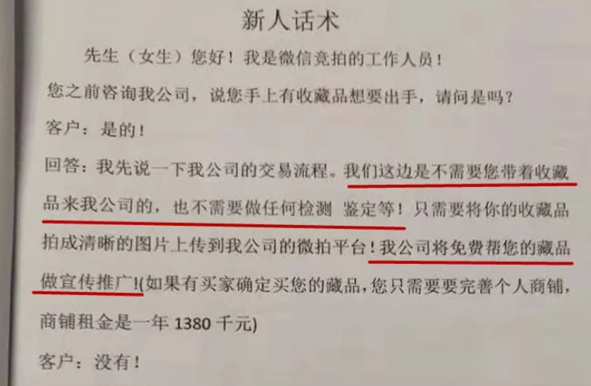 每天上班后,业务员便打给客户,自称是某文化公司的员工,专门负责微信竞拍。“公司不需要做鉴定、检测,只需将藏品的照片发布在网上商城内,将免费在线宣传。”