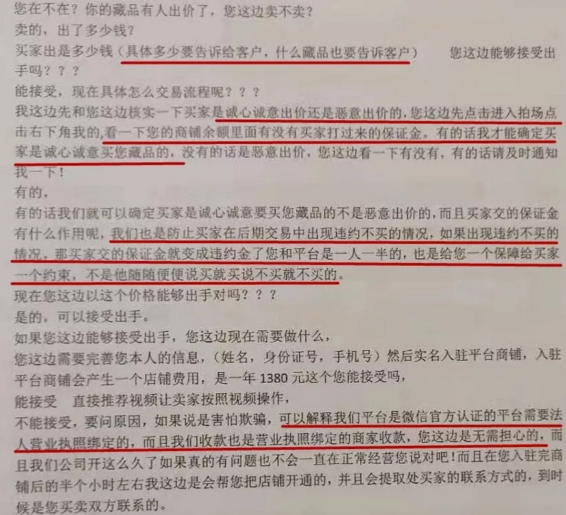 为了让戏做全套,在缴费一周后,员工还会冒充买家联系客户,表示十分想要购买藏品,但一直在国外出差,希望客户再等两个月,从此便再无音讯。